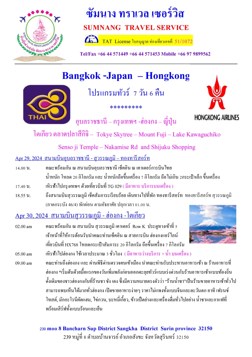 โปรแกรมทัวร์ 7 วัน 6 คืน Bangkok - Japan - Hongkong